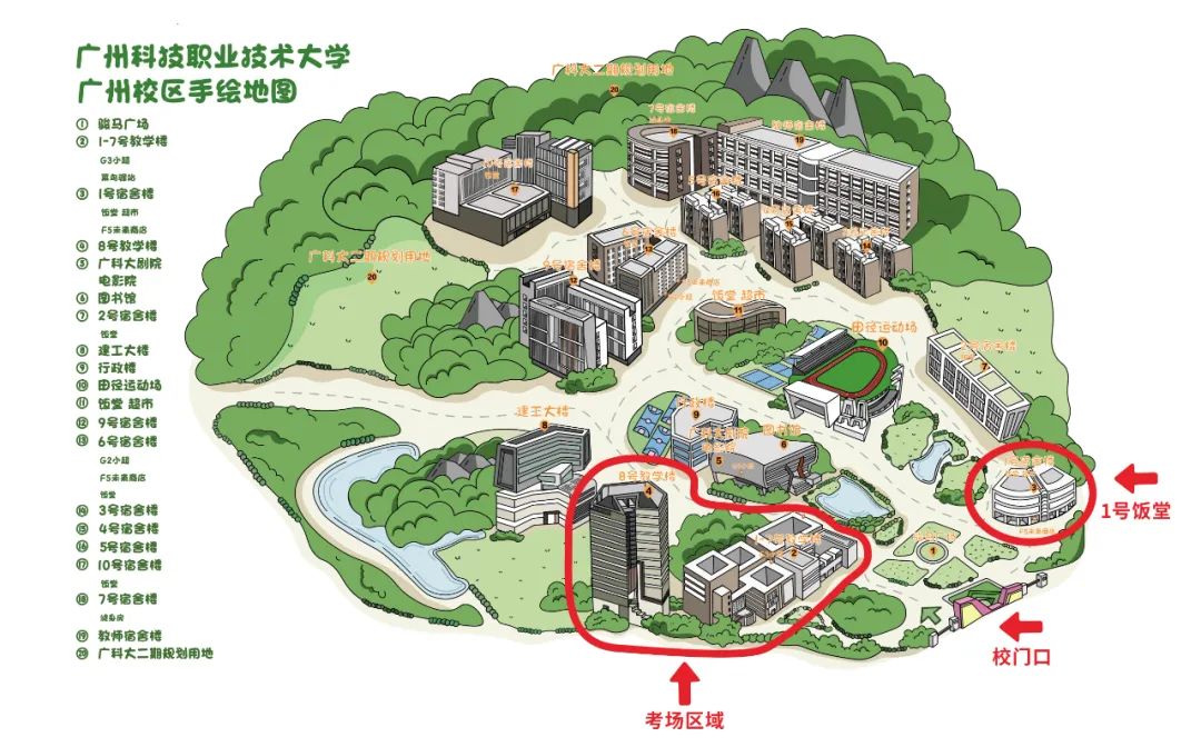 注意:考生只允许在上图中标注的红色区域内活动,切勿去往学校其他区域。